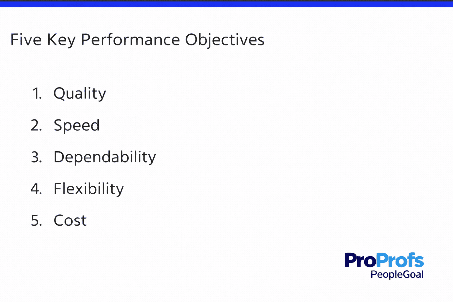 Operational performance objectives (also called operations performance objectives) refer specifically to how well a business’s core operations, like production, delivery, and service, perform against the five benchmarks of quality, speed, dependability, flexibility, and cost.
